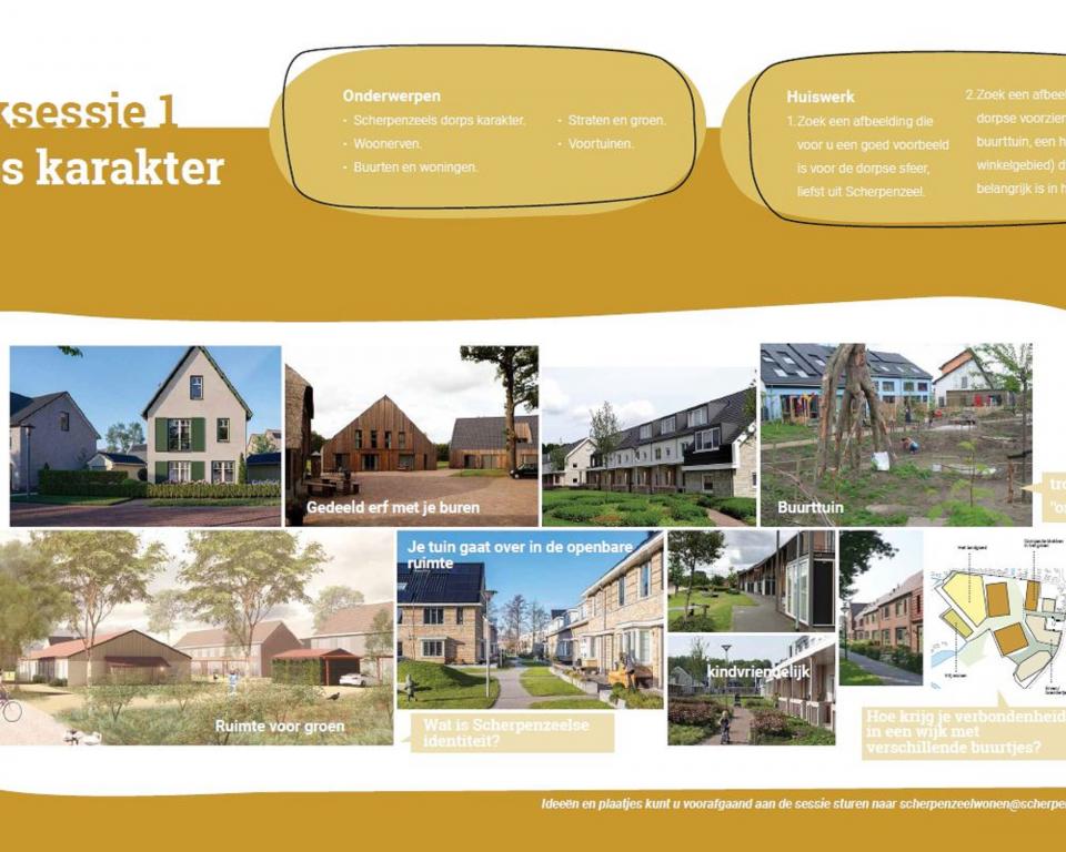 Tijdens de werksessie gaan we in op vier thema’s: ‘invulling van de openbare ruimte’, ‘woningbouwprogramma’, ‘dorps karakter’ en ‘mobiliteit in de wijk’. Deze thema’s bleken belangrijk voor de invullers van de vragenlijst over De Nieuwe Koepel. Daarom worden deze verder per groep aan een tafel behandeld. De huiswerkopdrachten worden gebruikt als openingen voor een gesprek.